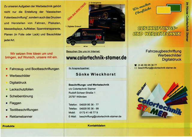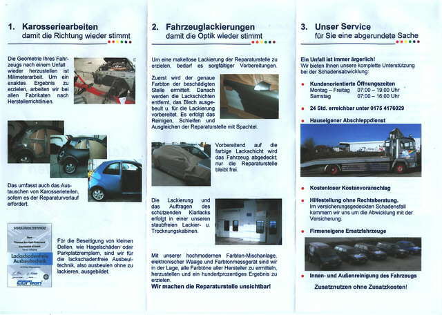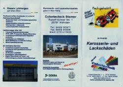 Keine Zeit zur Inspektion, zum TÜV oder zur AU zu fahren? - Fragen Sie uns! Wir kümmern uns darum, dass Ihr Fahrzeug in die Werkstatt Ihres Vertrauens kommt.Colortechnik STAMER * Rudolf-Scheer-Str. 1 * 25797 Wöhrden, Tel.: 04839-95 36 77, Fax: 04839-95 36 99 |