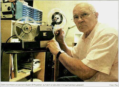 Aber Dierk Vornheim versteht sich nicht nur als Cutter (so heißen die für den Schnitt Verantwortlichen in Filmkreisen), sondern auch ein wenig als Drehbuchautor, verfasst unter anderem Titel und Bildtexte. Am Medium Film fasziniert den gelernten Funktechniker. der bis 1999 bei Norddeich-Radio in Emden/Ostfriesland Dienst tat. dass man „immer wieder ein stilles Vergnügen" habe, wenn man sich alte Aufnahmen anschaue. Auch selber betätigte er sich hinter der Kamera, die Ausflüge und Auftritte des Spielmannszuges stammen von ihm.