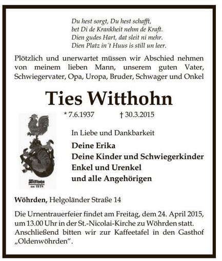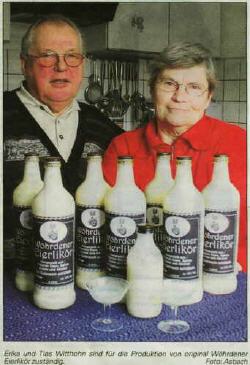 In Erika (69) und Ties Witt hohns (68) Küche dreht sich al les um Eierlikör. Wöhrdener Eierlikör. Vor fast 20 Jahren hat Erika Witthohn das Rezept gemeinsam mit anderen Frauen vom Häkelbüdelclub des Sied lerbundes ausprobiert. Auf dem Wöhrdener Jahrmarkt und auf Festen haben die Frauen das sahnige Gebräu verkauft. Damit die viele Arbeit gerecht verteilt war, wurden die Küchen der Frauen reihum vom Puderzucker und Eigelb verklebt.