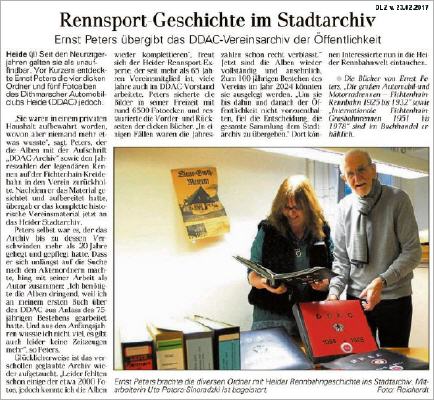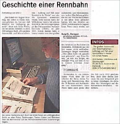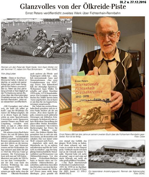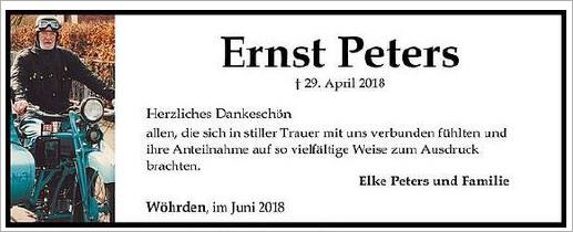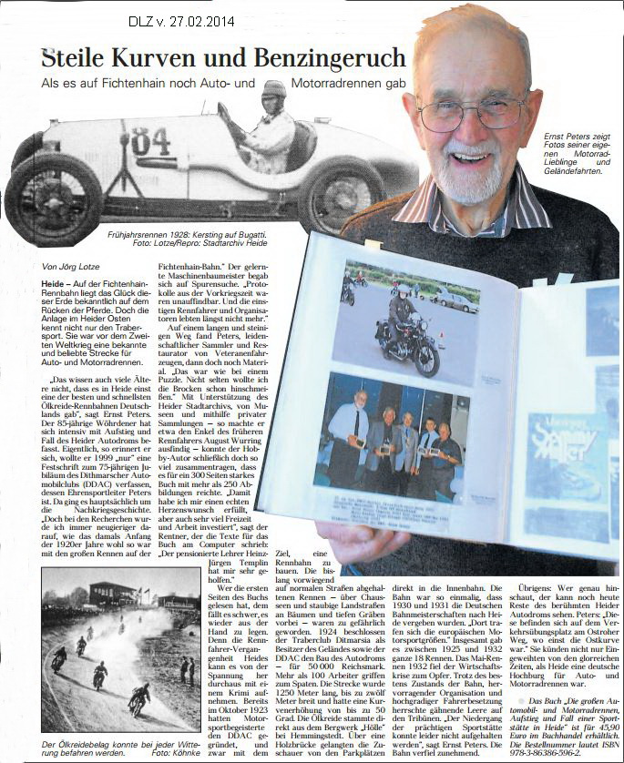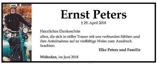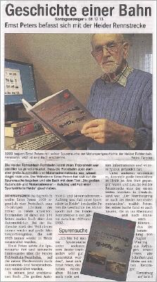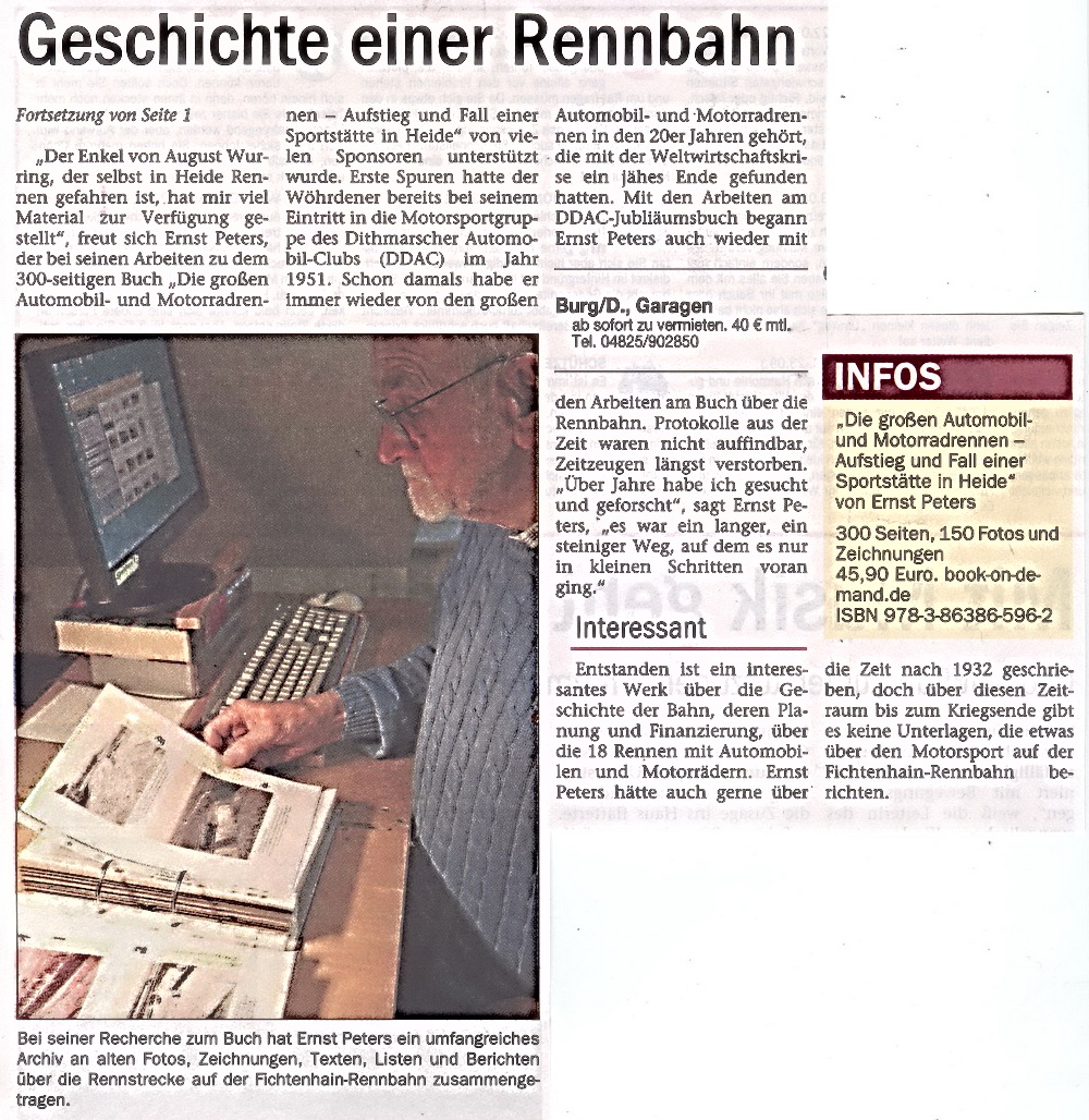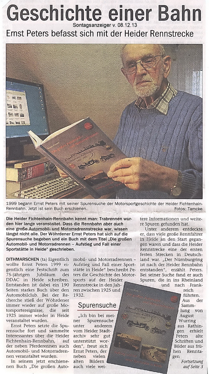 Bis vor zwei Jahren saß Ernst Peters noch regelmäßig auf dem Motorrad. Aus gesundheitlichen Gründen kann er das zu seinem Bedauern heute nicht mehr. Inzwischen hat er das Schreiben für sich entdeckt. In den vergangenen Jahren hat er ein umfangreiches Archiv über den kreisweiten Motorsport und den Dithmarscher Automobil Club (DDAC) zusammen getragen. Seine Hilfsbereitschaft hat der ehemalige Pannenhelfer nicht verloren. „Wenn ich kann, helfe ich natürlich gerne", sagt Ernst Peters. Das sei allerdings immer schwieriger, denn an die „modernen Motoren kommt man oftmals nicht mehr ran". (Quelle: DLZ v. 24.08.2010)