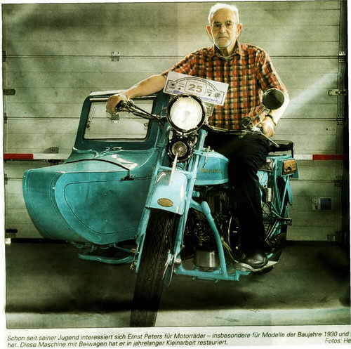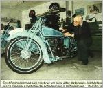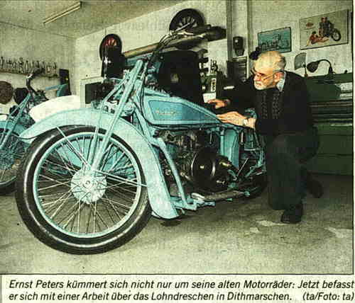 Ernst Peters ist vernarrt in alte Autos und, noch viel mehr, in alte Motorräder. Vor ungefähr 30 Jahren begann der heute 70jährige Wöhrdener, Fahrzeuge von anno dazumal zu restaurieren. Zuerst möbelte er ein heruntergekommenes Auto, einen Hanomag Kurier, auf. Sehr bald verlegte sich Peters darauf, in seiner Privatwerkstatt - einer Halle, die früher einmal als Mähdrescher-Garage diente - Jahrzehnte alte Motorräder in ihren Origmalzustand zu versetzen. Nicht viele, aber dafür jedes einzelne mit Hingabe und großer Sorgfalt bis ins Detail. Heute ist Peters stolzer Besitzer einer Harley-Davidson mit Seitenwagen von 1927, einer Peugeot-„Rennmaschine" aus dem Jahr 1907, einer Imperia „Berggeist" von 1930, einer englischen Triumph von 1915 mit äußerst seltenem Korbseitenwagen und von zwei Motorrädern des Typs Victoria KR 6 von 1928, eine davon samt aufwendig wiederhergestelltem, schmuckem Seitenwagen. Peters nimmt sich nur „interessante" Vehikel vor. Motorräder mit ausgefallener Ausstattung oder besonderer Technik.