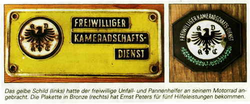 Glücklicherweise kam dem heute 82 Jährigen damals ein vorbeifahrender Motorradfahrer zu Hilfe. Gemeinsam mach ten beide die Maschine des Wöhrdeners wieder flott. Von der selbstlosen Unterstützung des anderen Verkehrsteilnehmers war Ernst Peters so angetan, dass er sich dazu entschloss, ehrenamtlicher Pannenhelfer beim Allgemeinen Deutschen Automobil Club (ADAC) zu werden. Noch im selben Jahr trat er dem freiwilligen Kameradschaftsdienst des Verkehrsclubs bei er ist seit 1952 Mitglied - und wurde damit einer der ersten gelben Engel in Dithmarschen. Damit erklärte sich Peters dazu bereit, in Not geratenen Kraftfahrern zur damaligen Zeit zumeist Motorradfahrer aus der Patsche zu helfen. Die nötige Ausstattung bekam er vom ADAC]: Ein gelbes Erkennungsschild, das am Motorrad befestigt werden musste und ein kleines Verbandspäckchen. Das kam allerdings nie zum Einsatz. „Bei meinen Hilfeleistungen ging, es meistens um Pannenhilfe", sagt Peters. Als gelernter Maschinenbauer kennt er sich mit Motoren aus. Hilfebedürftige Motorradfahrer seien damals leicht zu erkennen gewesen, erinnert sich Peters. „Fast alle haben zu dieser Zeit einen gelben Schal getragen. Der war in Mode", sagt der Rentner. „Wer eine Panne hatte, knotete den Schal einfach um den Lenker." So war für jeden Vorbeikommenden auf den ersten Blick ersichtlich, dass Unterstützung benötigt wird.