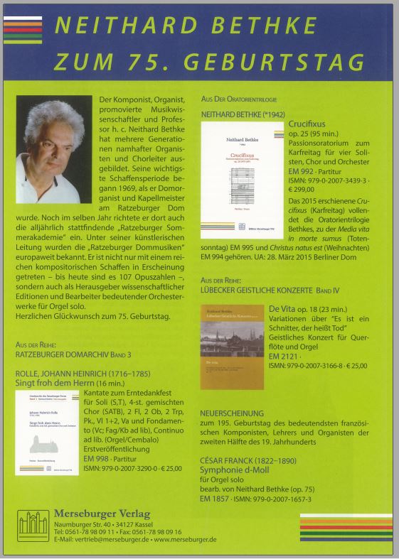 Oder genauer gesagt: Professor Doktor Neithard Bethke ist der Vater und Organisator der Ratzeburger Dommusiken. Geboren am 2. April 1942 in Wöhrden/Dithmarschen in einer kinderreichen Pastorenfamilie als achtes von 10 Kindern, hat ihn Musik von frühester Kindheit umgeben. Seine Mutter war professionelle Musikerin, sie war Klavierpädagogin und zu ihrer Zeit die jüngste Professorin ihres Faches. Sie wurde seine erste Klavierlehrerin. Schon mit 7 Jahren spielte er die Orgel im Gottesdienst in Wöhrden, mit 13 Jahren wurde er dort vertraglich fest eingestellt. Er studierte Kirchenmusik, Komposition, Klavier und Dirigieren in Lübeck, Freiburg, Paris, Madrid und Hamburg......weiter