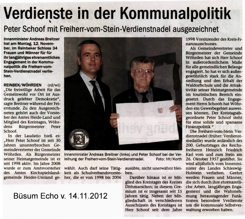 Das Land Schleswig Holstein verleiht Bürgern, die sich besonders im Bereich der Kommunalpolitik auf vielfältige Weise engagiert haben, die Freiherr vom Stein Verdienstnadel. Gestiftet wurde die Auszeichnung anlässlich des 200. Geburtstages des Freiherrn vom Stein am 26. Oktober 1957. Die Vorschläge für eine Ehrung können Landräte, Oberbürgermeister der kreisfreien Städte sowie die Bürgermeister der Städte mit mehr als 20 000 Einwohnern einreichen. (Quelle: DLZ v. 12.11.2012)