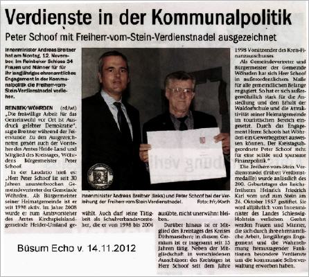 Wöhrden - Peter Schoof ist sichtlich stolz. Das ist kein Wunder, denn heute wird ihm die Freiherr-vom-Stein-Verdienstnadel überreicht. Um 10.30 Uhr soll der Bürgermeister aus Wöhrden und Vorsteher des Amtes Heider-Umland im Schloss Reinbek für seinen Einsatz in der Kommunalpolitik geehrt werden.