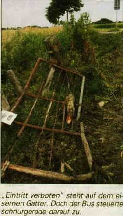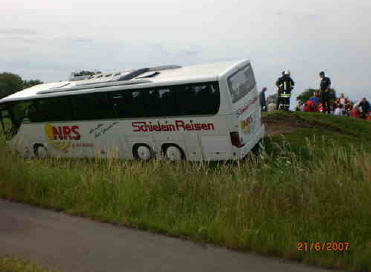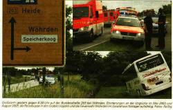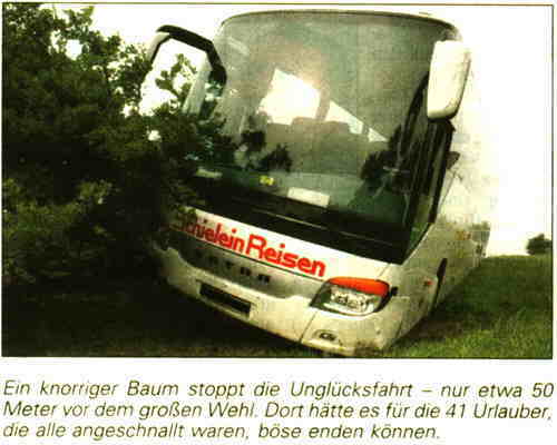 Nicht auszudenken, wäre der Bus umgekippt entweder hier, zuvor im Graben oder wenige Meter weiter im großen Wehl (natürlicher Teich). Wehrführer und Einsatzleiter Reimer Marsau aus Wöhrden mag es sich gar nicht ausmalen: ..Dann wäre alles zu spät." Polizeiobermeister Bernd Dieg aus Wesselburen atmet auf: .Sie haben mehrere Schutzengel gehabt" (Quelle: DLZ v. 22.06.2007)