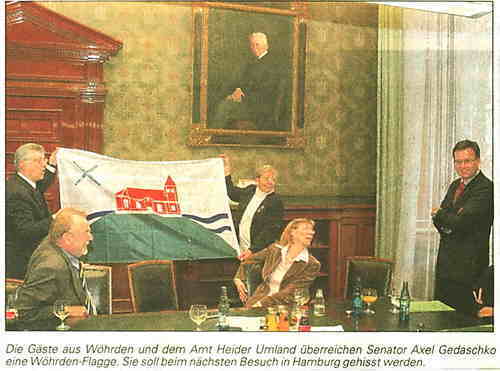 Und Peter Schoof kündigte feierlich an „In nicht allzu ferner Zukunft wollen wir Wöhrden und unser Amt einen halben Tag lang auf dem Rathausmarkt präsentieren.' Angedacht sind etwa Auftritte des Feuerwehrmusikzuges und von Trachtengruppen sowie das Grillen von Kohlbratwürsten. (Quelle: DLZ v. 19.01.2008)
