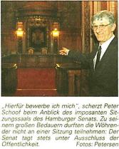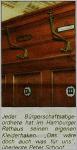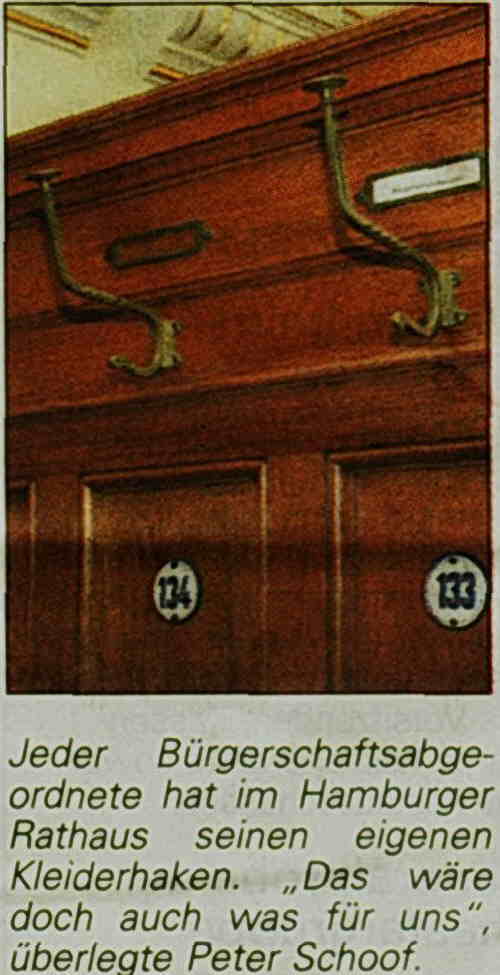 Interessiert ließen sich die Wöhrdener nach dem Frühstück durch die Räume des Senats und der Bürgerschaft führen. Besonders beeindruckten Bürgermeister Peter Schoof die zahlreichen Kleiderhaken der Bürgerschaftsabgeordneten. Dr. Sevecke erklärte: „Jeder hat seinen eigenen Haken, ebenso wie in der St.-Michaelis-Kirche und im Thalia-Theater." Auf kritische Nachfrage von Käte Templin schob er nach: „Aber ermäßigte Karten gibt es dort nicht."