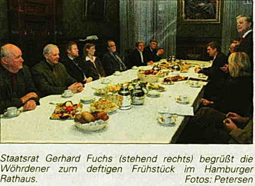 Mit einer viertel Stunde Verspätung kamen die Dithmarscher im altehrwürdigen Rathaus an - der Reisebus war im zähfließenden Morgenverkehr stecken geblieben. „Das ist Normalität bei uns", sagte Staatsrat Fuchs. Er begrüßte die Gäste bei einem Frühstück in Raum 1 des so genannten Senatsgeheges und verwies auf eine Novelle des Hamburger Dichters Detlev von Liliencron, der die Dithmarscher einst als Volksstamm aus gesundem und kräftigem Holz beschrieb, das sich in deftigen Dingen wiederfinde. „Ich hoffe, das Frühstück entspricht ihren deftigen Ansprüchen", meinte Fuchs lachend. Es gab Wurst- und Käseaufschnitt, Rührei und Obstplatten.