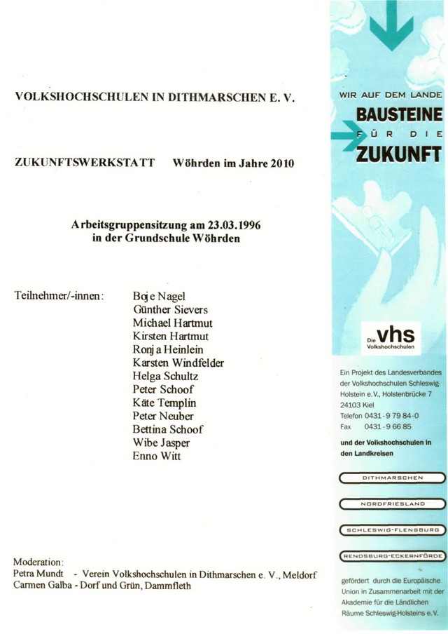 „Wünsche für Wöhrden“ wurden am 23.03.1996 in der Zukunftswerkstatt „Wöhrden im Jahre 2010“ geäußert. Damals trafen sich ebenfalls 13 Personen, die sich Gedanken um die Entwicklung von Wöhrden machten. Schon hier wurden Stärken und Schwächen aufgelistet. Themenblöcke, die heute so aktuell erscheinen, wurden damals schon angesprochen und was ist passiert? Nichts!