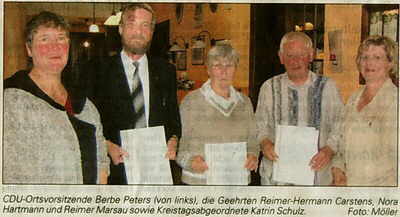 Als Vorsitzende bestätigt wurde Berbe Peters, neuer stellvertretender Vorsitzender wird Holger Greve. Beide sind auch als Delegierte für den Kreisverbandsausschuss bestimmt. Zu Beisitzern wurden Uwe Hermann Peters, Olaf Golombek, Stefanie Knippel und Reimer Hermann Carstens gewählt. Für 36-jährige Zugehörigkeit wurden Nora Hartmann, für 28 jährige Mitgliedschaft Reimer Hermann Carstens und Reimer Marsau geehrt. (Quelle: DLZ v. 12.05.2007)