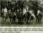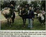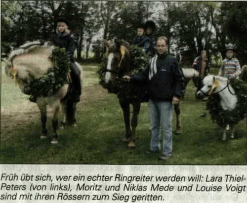 Einen Tag später hatte der Nachwuchs das Sagen, und mehr als 40 Kinder gingen beim Kinderringreiten an den Start Es siegten: Schritt bis fünf Jahre: Moritz Mede (21), Thorge Hansen (20), Jordis Hansen (17); Schritt ab sechs Jahre: Niklas Mede (23), Christin Gerdan 22) und Lara Looft (21); Trab: Louise Voigt (33), Jan Hendrik Popp (31), Laura Meyn (30); Galopp: Lara Thiel-Peters (22), Martje Stürtz (22) und Nele Wessel (20). Als beste einheimische Reiter erhielten Niklas und Moritz Mede sowie Lisa-Marie Peters jeweils einen Pokal.(Quelle: DLZ v. 01.07.2009)