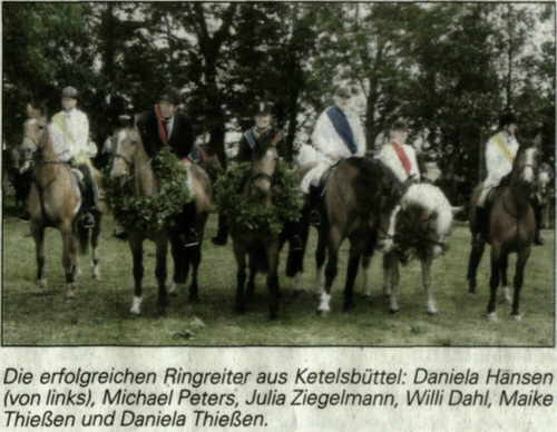 Wöhrden (rd) 51 Reiter haben jetzt in Ketelsbüttel um die Ringe gekämpft Nach spannenden Wettbewerben war am Ende wieder eine Amazone vorne: Meike Thießen wurde mit 24 Ringen Ketelsbütteler Königin, gefolgt von Willi Dahl (22), Daniela Thießen (21), Alina von Hemm (20) und Hans-Adolf Mede (20). Damit sind erstmals drei Amazonen in der Mannschaft für das Pokalringreiten am 18. Juli in Hemmingstedt