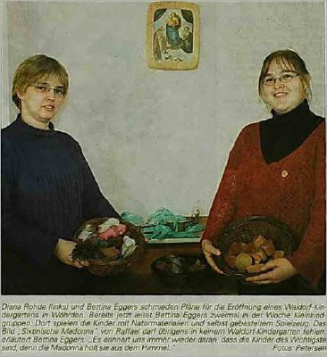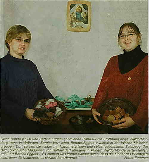 Besonderheiten des Waldorf Kindergartens: Da ist zunächst das Äußere - die Kinder spielen überwiegend mit Naturmaterialien und mit selbst hergestelltem Spielzeug. Wichtige Säulen der Erziehung sind zum einen „Vorbild und Nachahmung", indem die Erzieherin Fingerspiele oder Lieder vorführt und die Kinder dies nach machen. Zum anderen sind „Rhythmus und Wiederholung" wichtig. Deshalb gibt es einen festen und sehr strukturierten Tagesablauf. „Wir leben ganz intensiv mit den Jahreszeiten, aber auch mit den christlichen Festen. Denn wir sind zwar kein kirchlicher, aber ein christlicher Kindergarten." Diana Rohde fügt hinzu: „Wir wollen keine Konkurrenz zu Klein-Nicolai sein. Unsere Kinder kommen ja auch aus einem ganz anderen Einzugsbereich." Glücklich sind die beiden Frauen über die viele Hilfe, die es für die Waldorfidee schon von der Gemeindevertretung und den Einwohnern gab. „Wenn jetzt noch der Kindergarten kommt, dann sind wir wunschlos glücklich", sagt Diana Rohde. (Quelle: DLZ v. 29.01.2008)