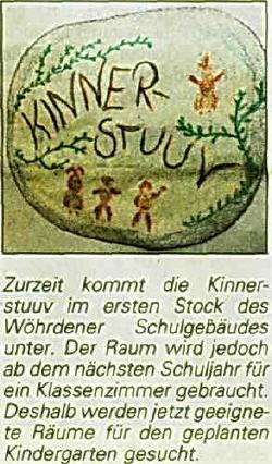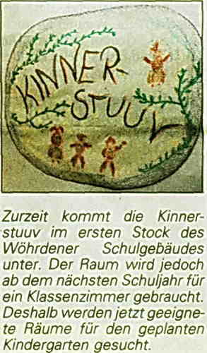 Bevor darüber entschieden wird, soll nun zunächst einmal der Bedarf ermittelt werden. Wer Interesse hat, sein Kind in einem Waldorf Kindergarten anzumelden, sollte sich melden unter Tel. 0 48 39/2 44. Zudem ist ein Informationsabend für Freitag, 15. Februar, ab 20 Uhr in der Kinnerstuuv geplant. Dort informiert Bettina Eggers über Waldorfpädagogik im Vorschulalter.