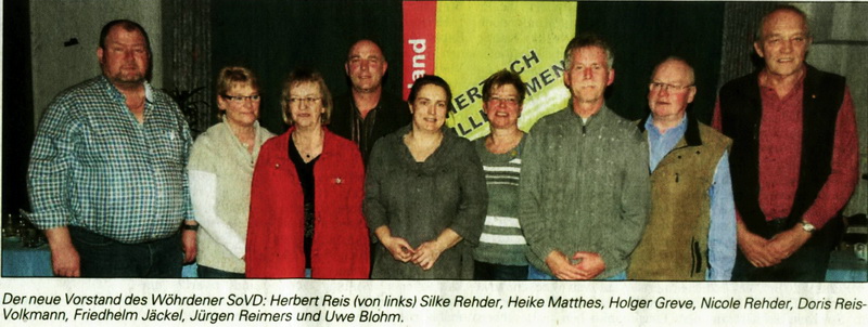 Ein neuer Vorstand wurde gewählt. Neuer Vorsitzender wurde Holger Greve, seine Stellvertreter Herbert Reis und Uwe Blohm, Schriftführerin wurde Britta Baumann. Schatzmeisterin wurde Heike Matthes, ihre Stellvertreterin wurde Nicole Rehder, zur Frauenvertreterin wurde Doris Reis Volkmann gewählt, Beisitzer wurden Silke Rehder, Jürgen Reimers und Friedhelm Jäckel. Für zehnjährige Mitgliedschaft wurden Agnes Hansen, Hans-Werner Schwarz, Hans Peter Ploog, Petra Hamann, Berbe Peters, Uwe und Susanne Blohm, Uwe Vornheim, Carsten Thode und Doris Reis-Volkmann. Und für 30 Jahre Mitgliedschaft wurde Elsbe Paulsen geehrt. Mit einem kleinen Imbiss ging die Versammlung zu Ende. (Quelle: DLZ v. 23.03.2012)