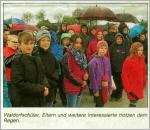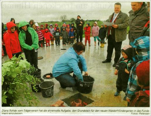 Trotz strömenden Regens hat der „Verein zur Förderung der Waldorfpädagogik an der Westküste" den offiziellen Termin in Wöhrden durchgezogen. Die Lütten vom Waldorf Kindergarten und von der Waldorf Schule, ihre Betreuer und Eltern sowie Lokalpolitiker zeigten sich ebenfalls hartgesotten und trotzten dem Regen mit Gummistiefeln, Schirmen und Musik. Sie haben Erfahrung mit extremem Wetter: Zum Spatenstich vor sechs Monaten standen alle bei Eiseskälte auf dem Feld zwischen Nixdorf und Mühlenweg. Auf dem Gelände entsteht der neue Waldorf Kindergarten, der am 1. August eröffnet werden soll. Wie die Vorsitzende des Trägerverein, Diana Rohde, meinte, könne es nun ganz schnell gehen mit dem Neubau. Denn der wird in Holzständerbauweise errichtet, die Wände sind bereits fertig und müssen nur noch montiert werden.