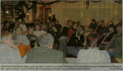 Ohne Gegenstimme beschloss der Förderverein Grundschule Wöhrden, das Projekt Waldorfschule in Zusammenarbeit mit der Gemeinde voranzutreiben. Federführend ist weiterhin die Vorsitzende des Fördervereins, Diana Rohde. • Wer sich bei ihr informieren oder an dem Projekt aktiv mitarbeiten will oder wer Interesse an einem Schulplatz hat, melde sich bitte unter Tel.: 048 39/203. (Quelle: DLZ v. 22.12.2005)