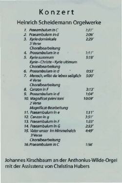 Zum Konzertabend in St.-Nicolai wird Gertrud Wagner aus Wöhrden die Biographie Heinrich Scheidemanns vortragen und der Musikwissenschaftler Dr. Hendrik Lücke aus Hamburg eine Einführung in dessen Werke geben. Der Eintritt ist frei. (Quelle: DLZ v. 31.08.2006)