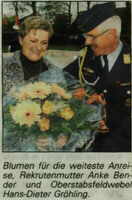 Doch zuvor hatten „Spieß" Oberstabsfeldwebel Hans-Dieter Gröhling und Rekrut Jan Täubert aus Rostock in teils humorvollen Worten deutlich gemacht, dass das Betriebsklima in der Heider Ausbildungs-Truppe stimmt. Gröhling wies auf das soziale Netzwerk hin, das für die jungen Rekruten in der Bundeswehr bereit steht. Es könne aber Elternhaus und Familie nicht ersetzen. Er freue sich deshalb über die zahlreich in Wöhrden anwesenden Angehörigen. Stellvertretend für alle überreichte er der Mutter mit der weitesten Anreise eine Blumenstrauß: Anke Bender aus Landsberg in Bayern.