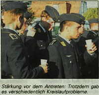 Für eine ganze Anzahl seiner Kameraden war die Feier allerdings schon vor dem Gelöbnis oder vor dem Eid auf die Fahne zu Ende. Der lange Tag und das Wetter forderten ihren Tribut Immer wieder wurden einzelne wegen Kreislaufschwierigkeiten von den Sanitätern aus der Formation geholt Nicht immer soll ein Mangel an körperlicher Fitness schuld gewesen sein. Wie alte Hasen wissen wollten, könne es auch den Durchtrainiertesten treffen. Doch letztlich verlief der Abend störungsfrei und ohne Probleme, gekonnt umrahmt vom Wehrbereichsmusikkorps. Dessen Leistung bedachten auch die von ihrem eigenen Blasorchester verwöhnten Wöhrdener mit Beifall. (Quelle: DLZ v. 13.05.2006)