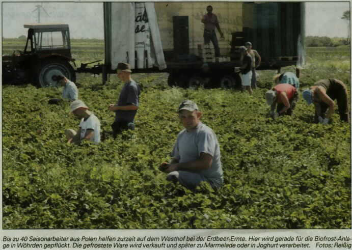 Seit rund zwei Wochen werden auf dem Westhof Erdbeeren geerntet Wenn die 30 bis 40 fleißigen Erntehelfer aus Polen nicht mit dem Pflücken beschäftigt sind (das geschieht vornehmlich vormittags), jäten sie Möhren, pflanzen Blumenkohl oder hacken Unkraut auf den anderen Äckern, erklärt der landwirtschaftliche Leiter des Westhofes, Agraringenieur Jens Schutt. Weil es in diesem Jahr zur Erdbeer-Zeit so extrem trocken ist, musste ein Teil der Pflanzen (Einjährige) sogar auf dem fetten Marschboden beregnet werden.