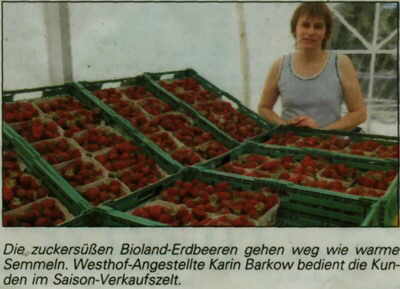 Neben Erdbeeren in verschiedenen Variationen (als Bowle, Cocktail, Kuchen, auf Biskuit und als Creation San Remo) gibt es auch deftige Grillwurst, die die Wöhrdener Feuerwehr brutzelt, und verschiedene Gemüsegerichte vom Gasthof Oldenwöhrden - dazu Säfte. Bier und Wein. „Alles bio",versichert Westhof-Mitarbeiterin Ina Kohnert, die das Fest organisiert. sprich:alle Zutaten sind aus kontrolliert ökologischer Landwirtschaft. Schließlich ist auch der Westhof ein streng kontrollierter Bioland-Betrieb mit einer breiten Produktpalette.