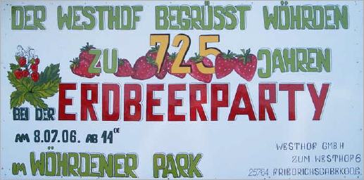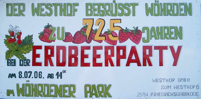 Wöhrden - Zum ersten Mal will Westhof-Besitzer Rainer Carstens zu Ehren der süßen, roten Früchtchen kräftig feiern. Und natürlich zum Geburtstag der Gemeinde Wöhrden, die in diesem Jahr bekanntlich 725 Jahre alt wird. Aus diesem Grund wird die große Westhof-Erdbeer-Party am kommenden Sonnabend, 8. Juli, mitten in Wöhrden, im Park vor der Kirche, stattfinden.